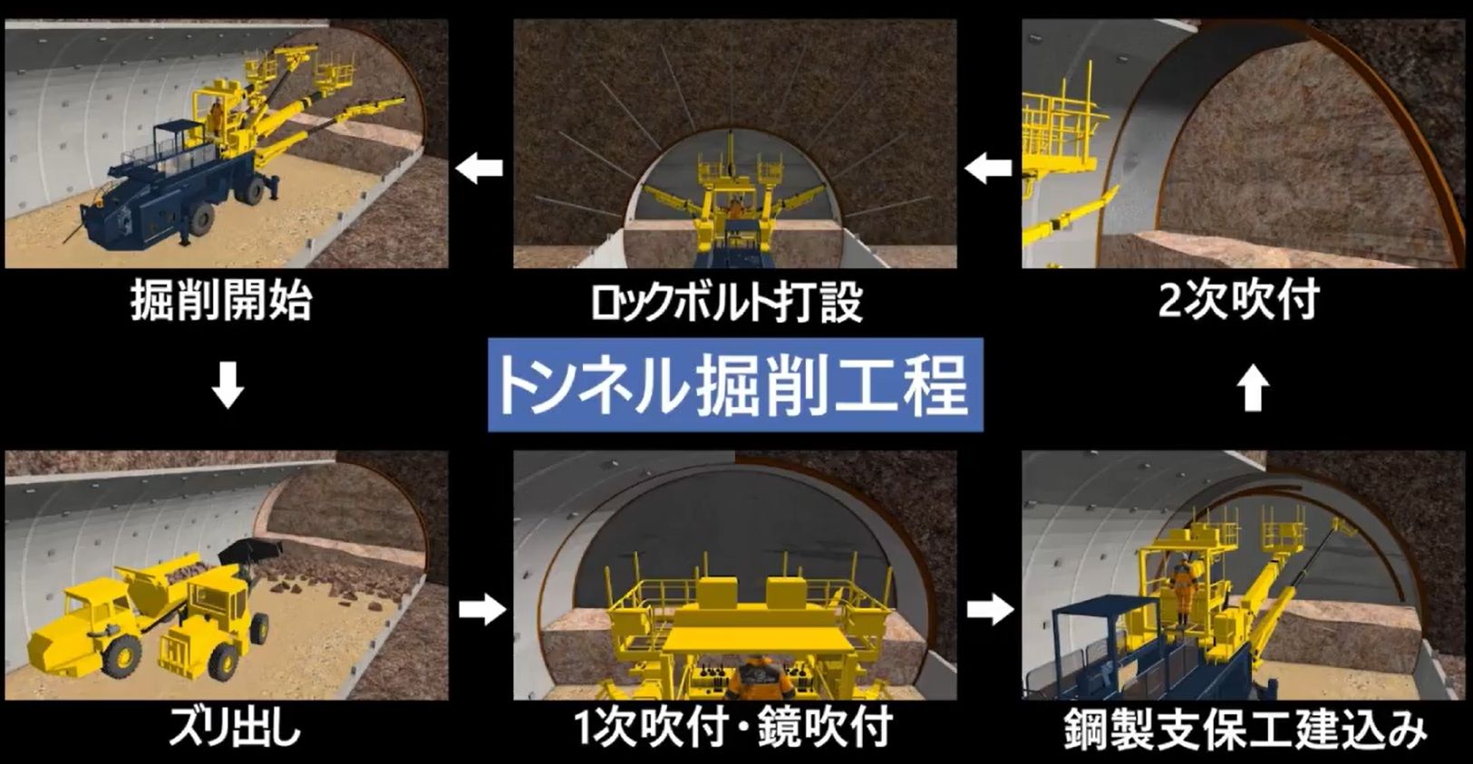 NATM(New Austrian Tunneling Method)工法によるトンネル掘削工程は以下の通りです。 以下の手順を繰り返し、1日に3~5m掘り進めていきます。